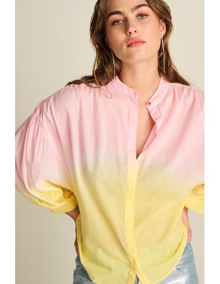 Ce chemisier rose a une coupe ample et est fabriqué en 100 % coton. Le chemisier présente un dégradé de couleurs inspiré de la technique d'aquarelle japonaise.