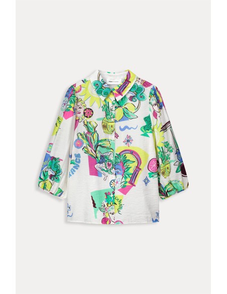 Ce chemisier blanc arbore des motifs peints à la main, inspirés des éléments typiques de la Sicile. Son mélange de viscose le rend plus écologique. Associez-le à un pantalon assorti pour un look complet !