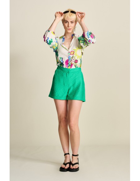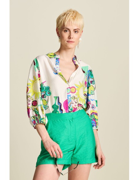 Ce chemisier blanc présente des motifs peints à la main inspirés d'éléments typiquement siciliens. Le mélange de viscose rend cet article "plus écoresponsable". Avec le pantalon assorti vous complèterez votre look !