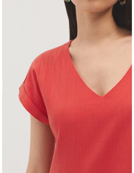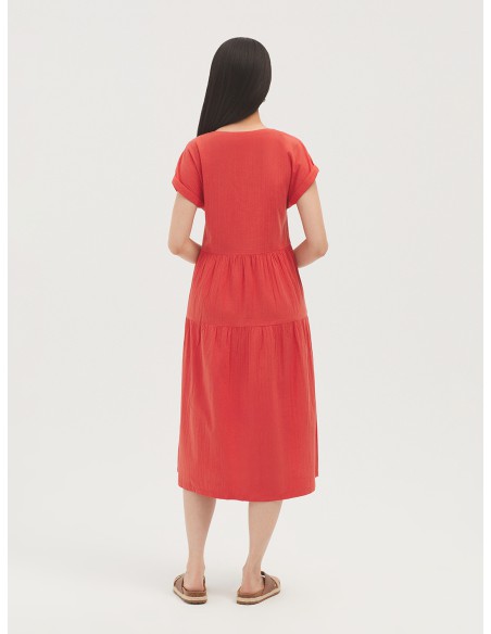 Découvrez notre robe confectionnée en seersucker de coton durable, alliant confort et durabilité. Dotée d'une encolure en V flatteuse et de manches courtes sans emmanchure pour une silhouette décontractée, elle présente une jupe avec deux découpes et des fronces qui apportent du volume et du mouvement au modèle. Parfaite pour une allure estivale décontractée tout en restant élégante et consciente de l'environnement.